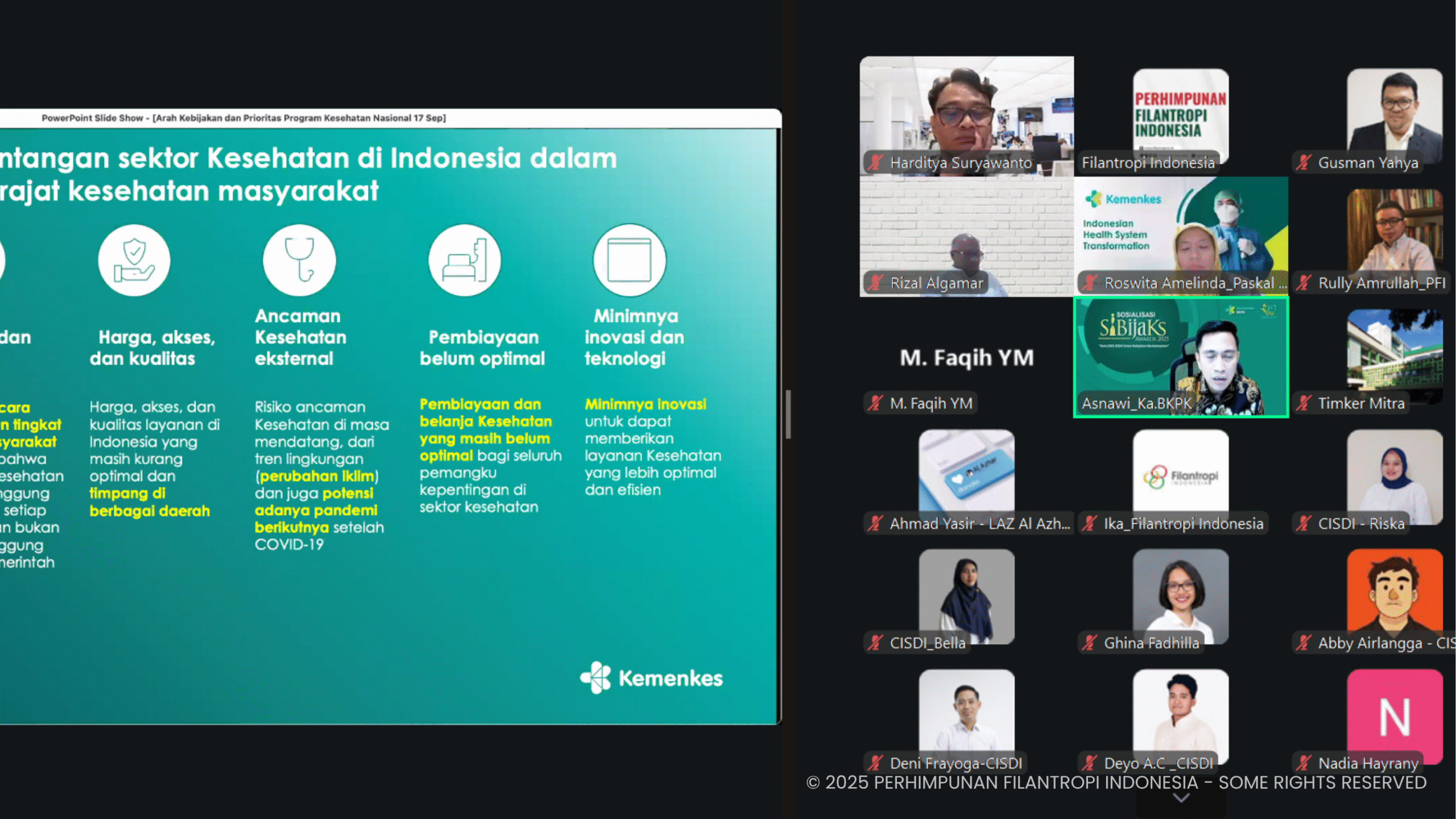 Kegiatan dibuka dengan pemaparan dari Biro Perencanaan dan Anggaran Kementerian Kesehatan, yang menekankan arah kebijakan Rencana Induk Bidang Kesehatan (RIBK) dan RPJMN 2025–2029. Disampaikan bahwa pencapaian target pembangunan kesehatan memerlukan sinergi antara pemerintah dan mitra filantropi, terutama dalam mendukung kerangka pendanaan serta penguatan layanan kesehatan di tingkat nasional dan daerah.
