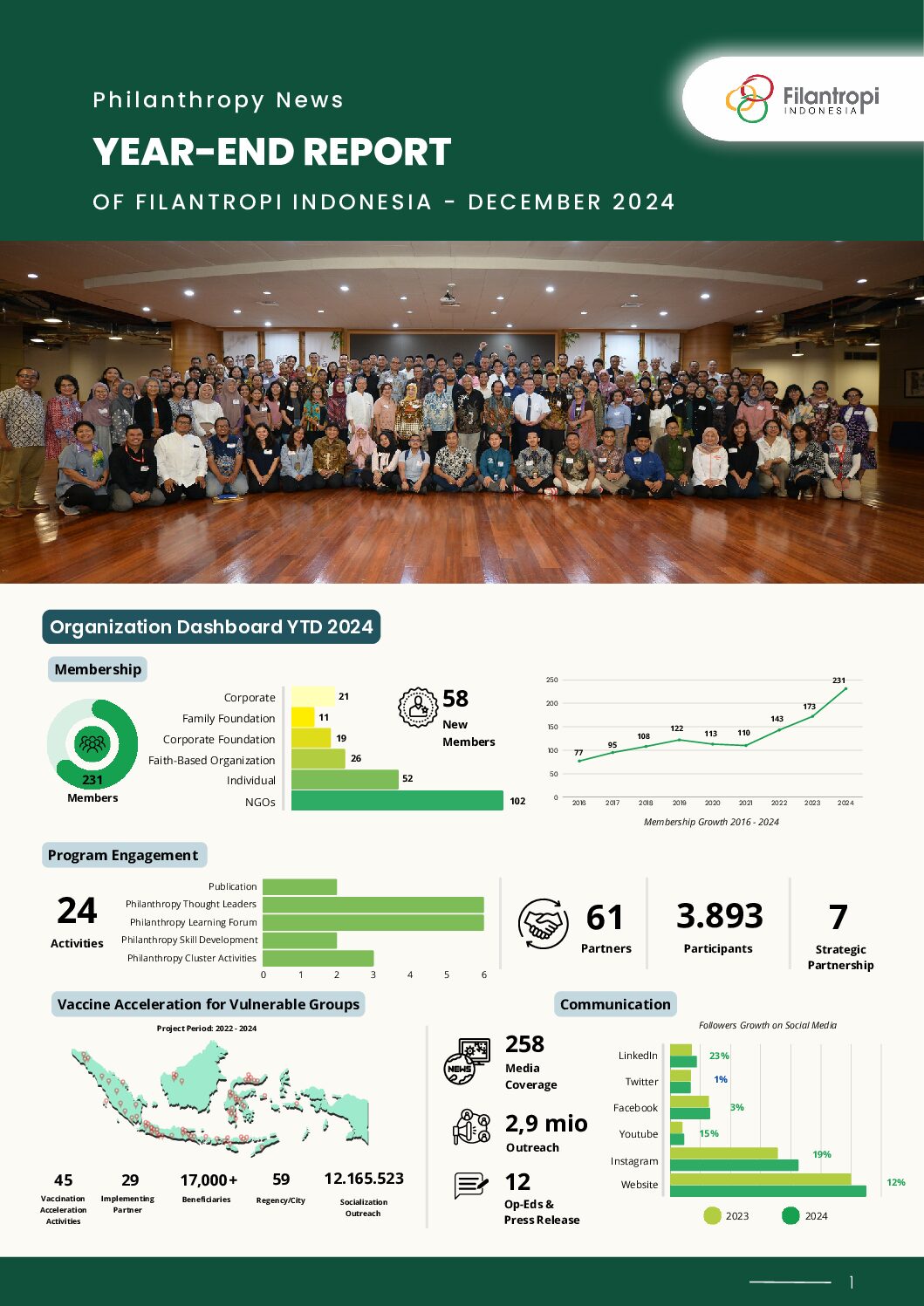 Perhimpunan Filantropi Indonesia mempersembahkan rangkuman pencapaian, aktivitas, dan pertumbuhan keanggotaan sepanjang tahun 2024 dalam Philnathropy News, Year-End Report 2024. Dengan total 231 anggota, 24 kegiatan, dan berbagai inisiatif baru, kami terus mendorong kolaborasi multipihak untuk mendukung Tujuan Pembangunan Berkelanjutan (SDGs). Year-End Report 2024 ini merangkum perjalanan, pencapaian, dan kontribusi kami sepanjang tahun dalam memperkuat ekosistem filantropi di Indonesia. Temukan sorotan kegiatan kami dan bagaimana kami terus berkomitmen menciptakan dampak positif bersama mitra dan anggota.